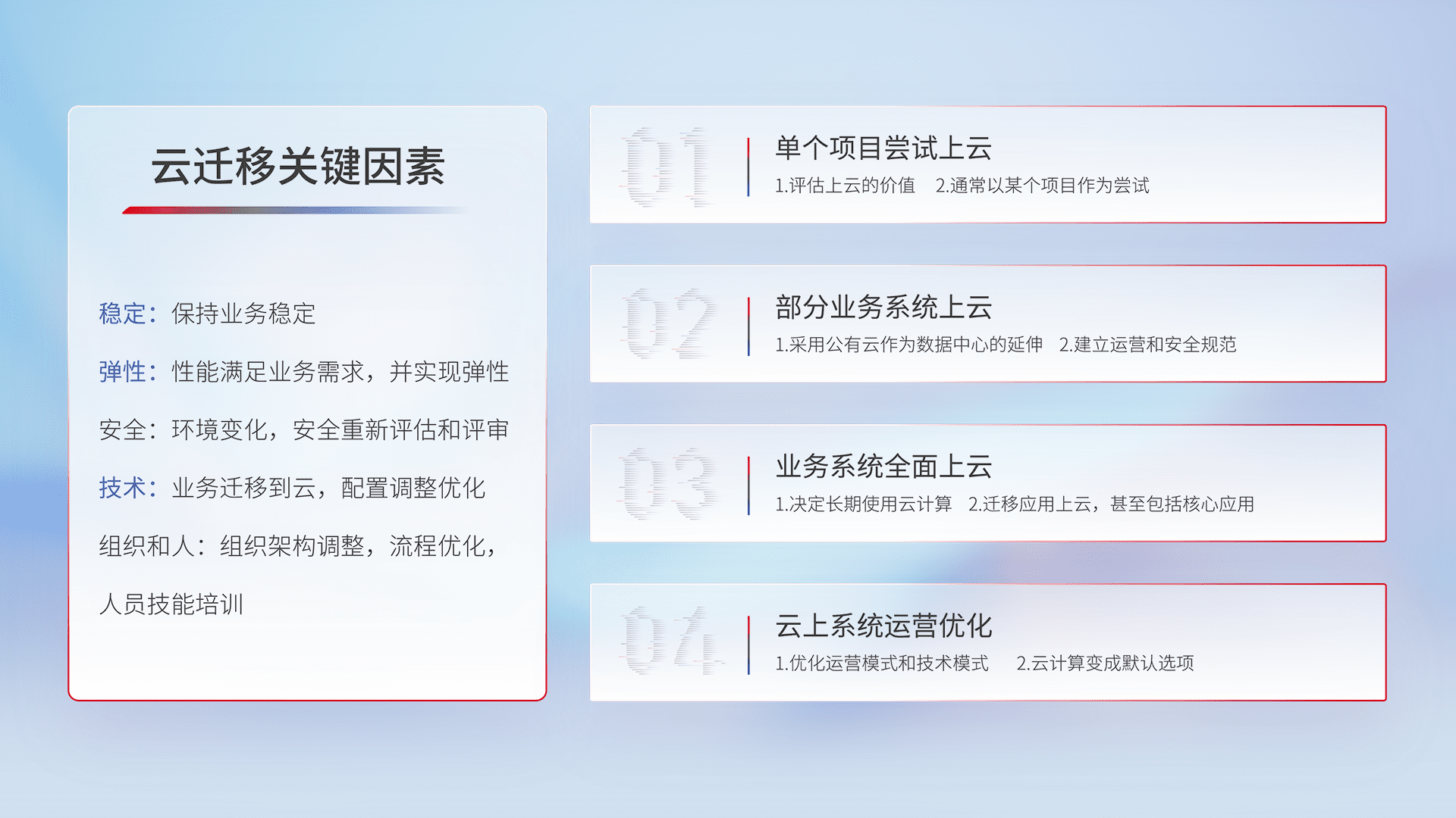 结合实际业务,,,,从规划设计、、、云平台选型、、云原生改造、、、、数据迁移、、集成交付,,迁移全过程为客户识别最佳上云路径,,,,做好风险识别管理,,,设计网络架构、、、、身份权限、、安全审计合规、、、、操作审计、、、日志审计、、监控告警策略、、多站点容灾设计等,,对云上基础设施进行整体规划,,提升IT治理水平,,,以满足弹性、、、、高可用、、、、高性能的需求。。。。